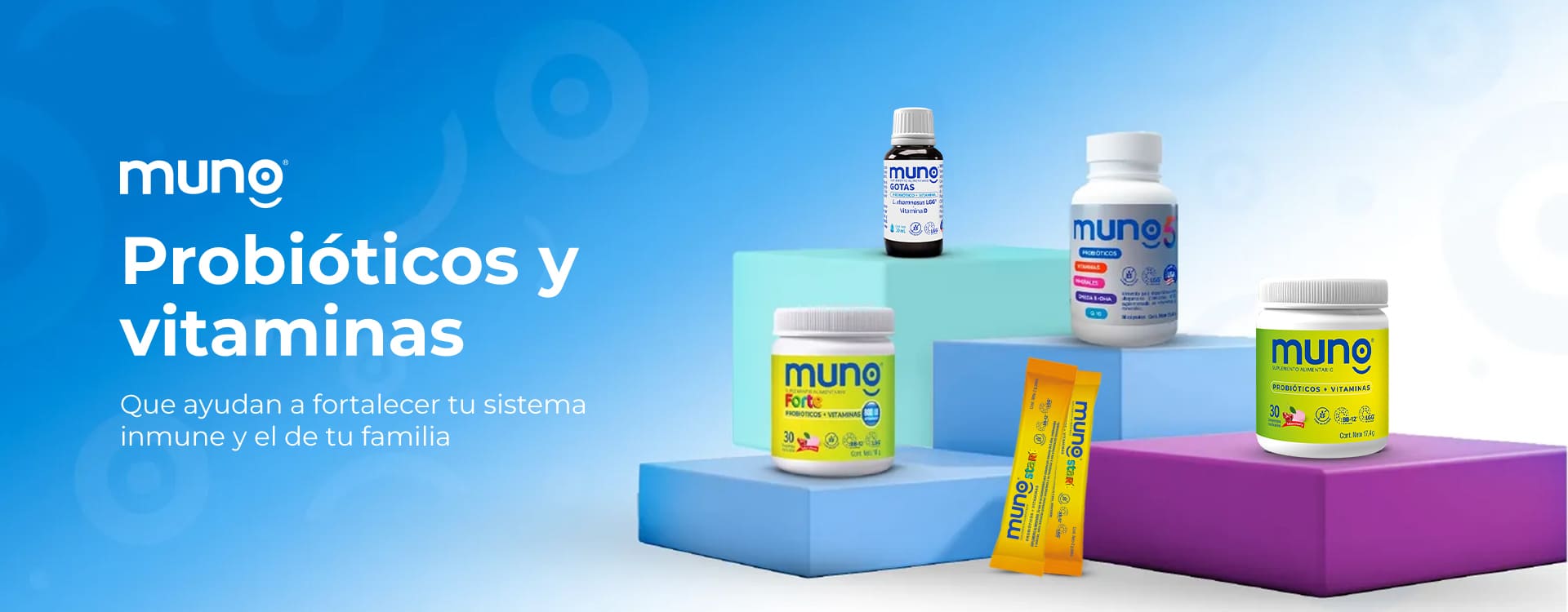 Muno ayuda a reforzar el sistema inmune de los que más quieres con sus probióticos y vitaminas en diferentes presentaciones.